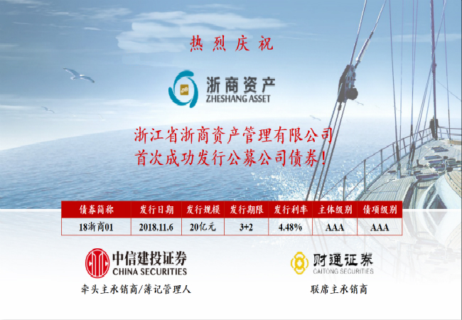 11月6日,浙江省浙商資產(chǎn)管理有限公司(簡稱“浙商資產(chǎn)”)首次成功發(fā)行公募公司債券,募集資金20億元,期限“3+2”年,票面利率4.48%(低于銀行三年期貸款基準(zhǔn)利率近30BP),由中信建投證券、財(cái)通證券聯(lián)合承銷。全場認(rèn)購倍數(shù)達(dá)1.83倍,投資者認(rèn)購踴躍。