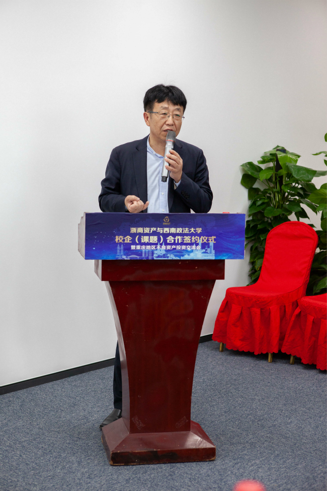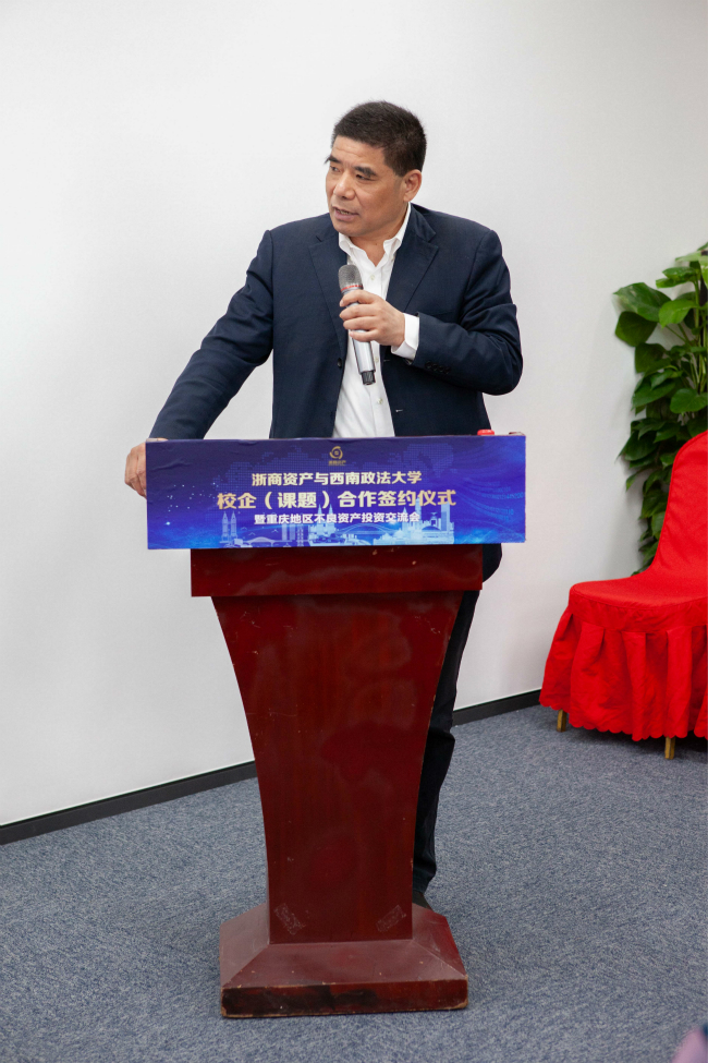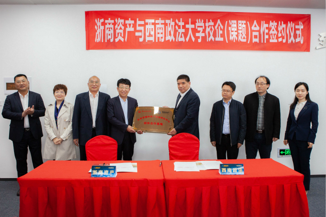 2019年5月9日上午,值川渝(重慶)辦事處開業(yè)之際,浙商資產(chǎn)舉辦了與西南政法大學(xué)校企(課題)合作簽約儀式暨重慶地區(qū)不良資產(chǎn)投資交流會。浙商資產(chǎn)常務(wù)副總經(jīng)理兼首席戰(zhàn)略官李傳全、業(yè)務(wù)副總經(jīng)理吳張根、總經(jīng)理助理兼財務(wù)總監(jiān)宮娟,西南政法大學(xué)副校長商文江、人工智能法學(xué)院院長陳亮等出席簽約儀式。